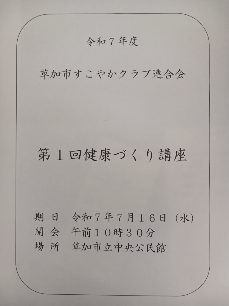 7月16日(水)草加市立中央公民館にて草加市すこやかクラブ連合会主催の健康づくり講座が開催されました。(財)健康生きがいづくり開発財団 認定アドバイザー 来生陸夫(きすぎりくお)様を講師に「居心地の良い暮らし方」と題し、高齢でも社会でも家庭でも幸せに暮らす5つの習慣について講演いただきました。日常生活での魔法の言葉として①ありがとう②ほめる③できる④笑む⑤いいよ(ゆるす)の5つをお話され、笑いの絶えない講演でした。